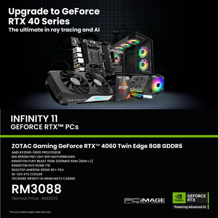 INFINITY 11 GEFORCE RTX™ PC - AMD RYZEN5-5600/ ZOTAC GAMING GeForce RTX™ 4060 Twin Edge 8GB/ MSI B550M PRO VDH WIFI/ 16GB 3200Mhz RAM/ 1TB NVME SSD/ SEGOTEP AN650W 650W 80+ PSU/ SE-224 XTS COOLER/ TECWARE INFINITY M ARGB MATX CASING