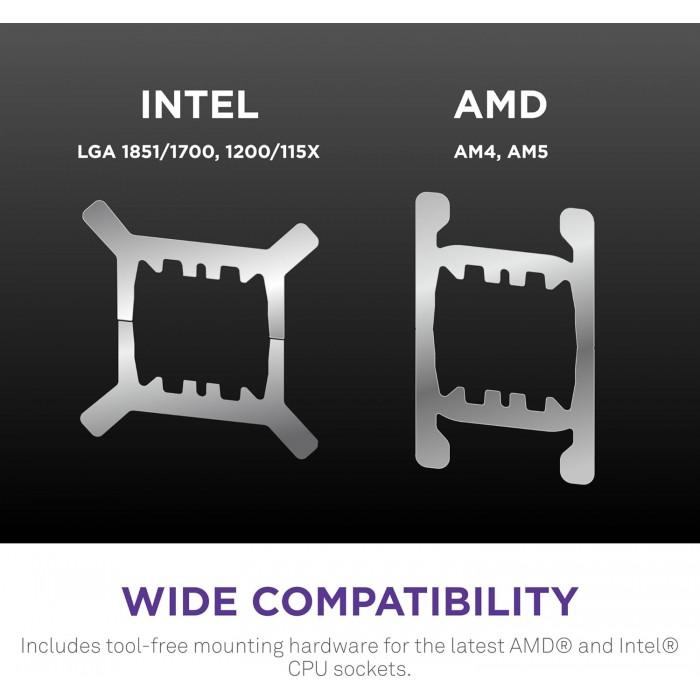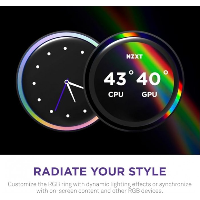 الكلمات الدليليلة About this item SUPERIOR COOLING: The custom-designed NZXT Turbine pump efficiently cools even the most heat-prone CPUs with its high flow rate and head pressure, resulting in a 10%* performance boost with less noise. BIGGER, BOLDER DISPLAY: Enjoy stunning visuals on the large 2.72-inch IPS LCD featuring crisp 640 x 640 resolution, smooth 60 Hz refresh rate, ultra-bright 690 cd/m² backlight, vibrant 24-bit color, and wide viewing angles. MORE PERSONAL THAN EVER: Display your favorite GIF or image, monitor real-time system performance, and integrate with Google Photos, Spotify, and YouTube. Sync the RGB LED ring with on-screen content and other RGB devices for a cohesive look. SIMPLE INSTALLATION: Get set up quickly with pre-applied thermal paste, a single breakout cable, and tool-free mounting brackets for the latest Intel (LGA 1851/1700, 1200/115X) and AMD (AM5, AM4) CPU sockets. VIBRANTLY COOL: The RGB Core single-frame fan on the radiator provides optimal airflow and vibrant lighting, along with a sleek, integrated design for easy connectivity and control.